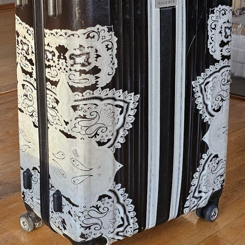 DAY ET koffert laget i lær, designet for unisex bruk. Kofferten har et mønstret ytre og fire hjul for enkel transport. Den åpnes med glidelås og har et romslig interiør for oppbevaring av klær og andre reiseartikler.
