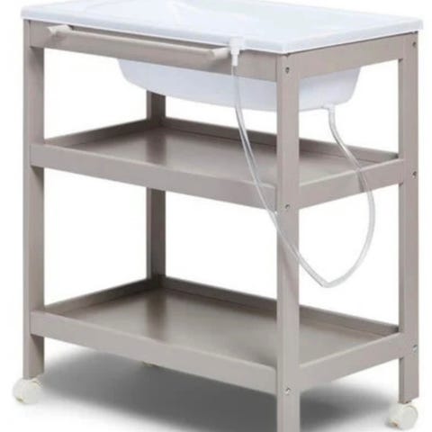 Kaxholmen stellebord i grå farge med oppbevaringslommer og hylle under. Laget i tekstil og metall. Passer for babystell.