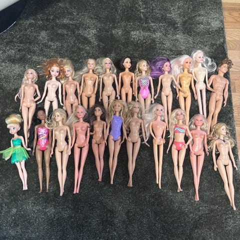 Barbie dukker med forskjellige antrekk og tilbehør, inkludert en havfrue-dukke med flerfarget hale, flere dukker med kjoler i ulike farger, en liten dukke med rosa kjole og en hest med rosa og turkise detaljer.