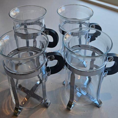 Bodum fransk presskanne kaffekanne i glass med metallramme og svart håndtak. Egnet for brygging av kaffe ved hjelp av pressmetoden.