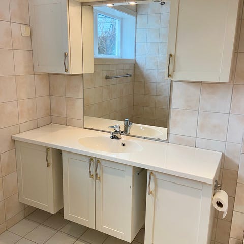 90x90 dusjkabinett, vask, skap, speil og lampe.