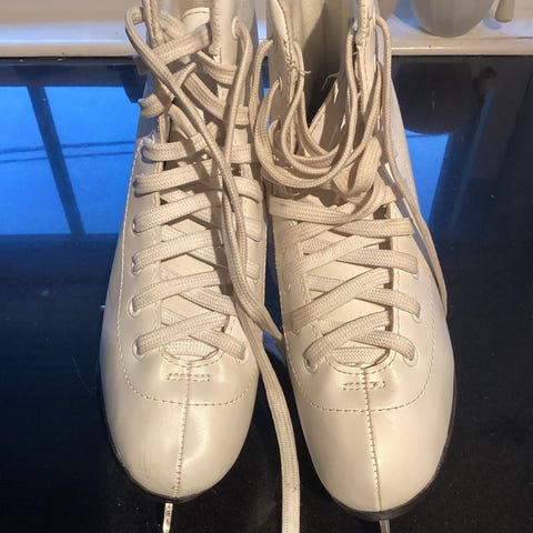 Hvite barneskøyter i størrelse 37, egnet for ulike former for skøyting. Skøytene har tradisjonelt snøresystem og solid konstruksjon for støtte og stabilitet på isen.