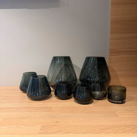 Tre minivaser/telysholdere fra Magnor glassverk selges samlet. Har kun vært brukt i forbindelse med visning, eskene er intakte. Serien er Halvor Bakkes «Rocks» og fargen er topaz - en varm fin bruntone.