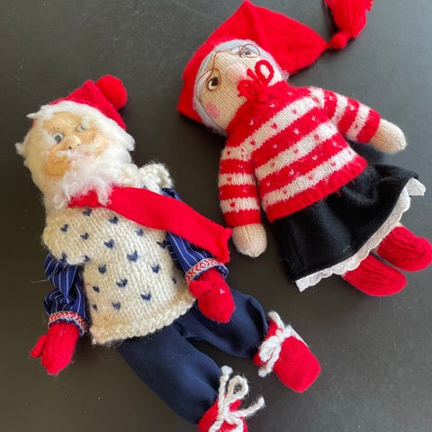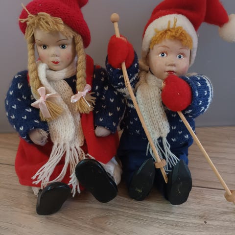 Den ene dukken har skjørt og leggings, den andre har bukse – begge med matchende luer og skjerf. De har solide trebein, er litt ustø, men er perfekte som dekor til jul, vinter, hytte eller barnerom.