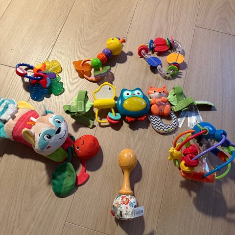 Fisher-Price barnleketøy aktivitetsleke med fargerike figurer, inkludert dyr og blomster. Designet for å stimulere barnets sanser og motoriske ferdigheter gjennom lek. Laget av plast og stoffmaterialer, egnet for små barn.