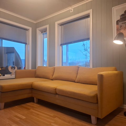 5 seters sofa, med lagring og sovesofa. Kjøpt for 2 år siden, trolig fra Møbelringen, men er litt usikker. Pent brukt, ingen synlige bruksmerker.