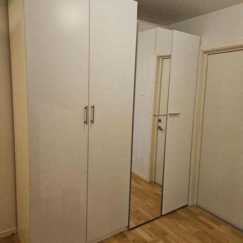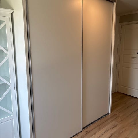 3 stk. skyvedører til garderobe, trolig Elfa. Hvit utførelse med profiler. En dør med speil. I god stand, liten avskalling i karm på ene døren, se bilde. Gulv- og takskinne følger med.