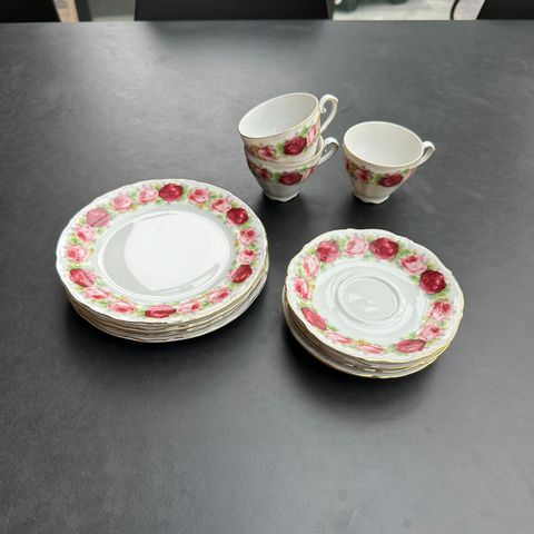 Ulike deler porselenservise med blomsterdekor/roser i rosa fargetoner. Ligner Royal Albert Old English rose / Porsgrunn oldemors roser / mormors roser / Rosenthal Cecilie. Noen deler med tysk stempel og noen uten. Noen deler har mer bruksmerker enn andre. Se mer info per del under og bilder for detaljer. Selges som de er.