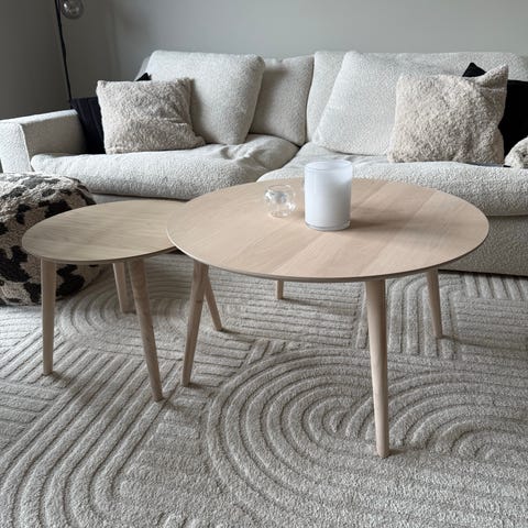 Rundt sofabord med hylleplan i rottingvev. Ben av massiv bøk og bordplate av bøkefinert MDF. Mål: Høyde 45 cm, Ø 108 cm. Hylleplan: Ø 80 cm. Høyde fra gulvet til hylleplan 12 cm. Avstand mellom hylle og bordplate 19,5 cm.