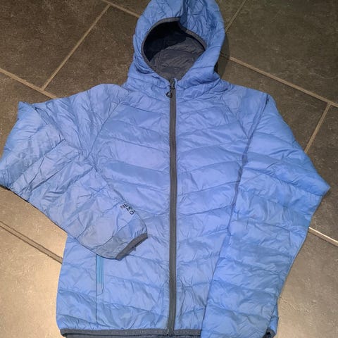 Pent brukt mørkeblå dunjakke i str xs med hette.