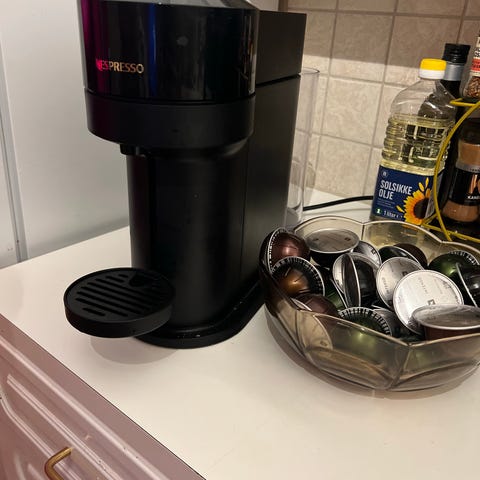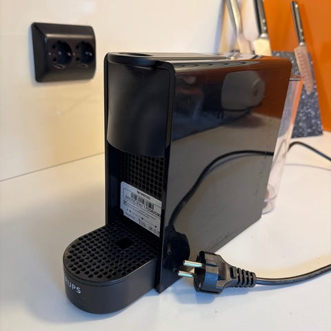 Nespresso Essenza Mini kapselkaffemaskin i rød farge. Kompakt design egnet for enkel kaffebrygging med kapsler. Passer til hjemmebruk eller små kontorer.