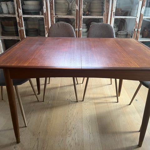 Klassisk og solid teak spisebord, trolig fra 60–70-tallet, selges med 6 stoler og 2 ileggsplater. Bordet er stabilt og fullt brukbart.