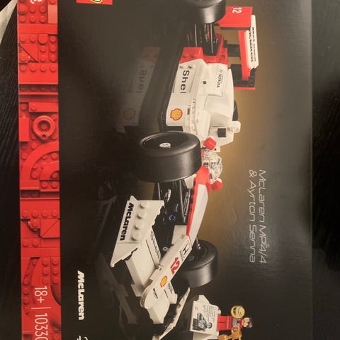 LEGO Icons McLaren Senna Formel 1 modell med 693 deler. Settet inneholder detaljerte komponenter som gjenskaper McLaren Senna racingbilens utseende og funksjoner.