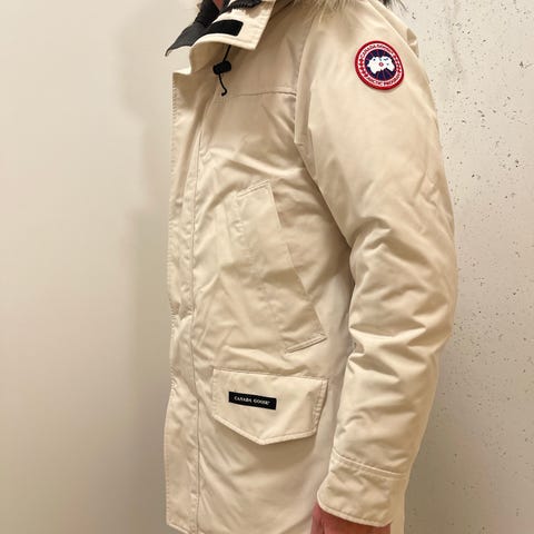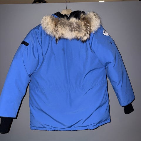 Canada Goose Vinterjakke i størrelse M, blå farge, laget av dun. Jakken er designet for utendørs bruk i kaldt vær.