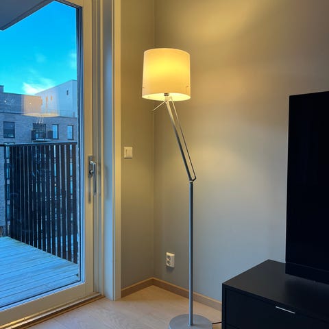 IKEA gulvlampe med stålbase og hvit lampeskjerm i glass. Høyde 179cm. For E27 pære. Lampen har fotbryter for enkel av- og påslåing. Passer til bruk i stue eller andre rom som trenger generell belysning. Selges grunnet flytting. Må hentes!