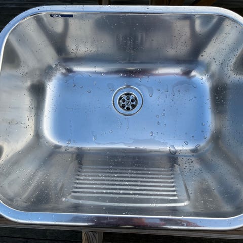Vaskekar/utslagsvask i rustfritt stål beregnet for veggmontering og nedfelling. Leveres UTEN veggfeste, skruer, avløpsrist, gummipropp og kjede. (kun som avbildet). Mål: dybde: 250 mm, utvendige mål: 500x450 mm