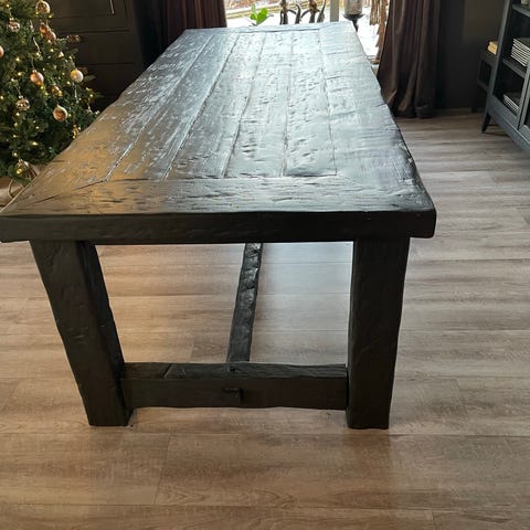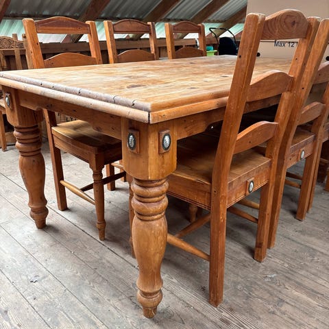 Grovt å solidt spisebord med 6 stoler. Plata er 6 cm. Selges pga plassmangel. Stett og rygg på stoler er malt i en skog/mosegrønn farge. Bordplata er satt inn med osmo beis i gråtonet. Litt bruksmerker.
