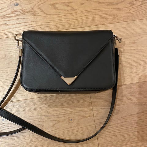På innsiden har vesken en lomme med glidelås og to små lommer som forsøkt vist på bilde 3