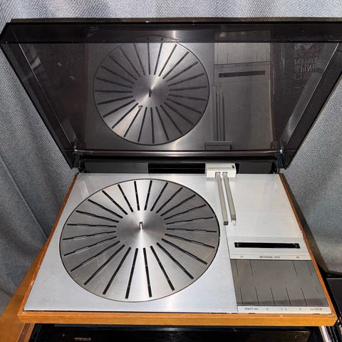 Bang & Olufsen Platespiller. Enhet med integrert platespiller og kontrollpanel. Designet med metalliske og svarte detaljer. Egnet for avspilling av vinylplater.
