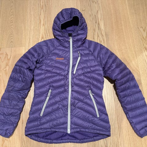 Bergans modell "Slingsbytind" med hette, meget lett og komprimerbar, jakken er vindtett og vannavvisende med pertex microlight-materiale, designet for topptur og fjellsport, blå med rosa detaljer, innerlomma fungerer som kompresjonslomme, jakken er brukt og vil derfor ha små estetiske bruksmerker, men den er fortsatt hel og funksjonell, alt av snorer og glidelåser er hele og intakte, se siste bilde for mer informasjon,