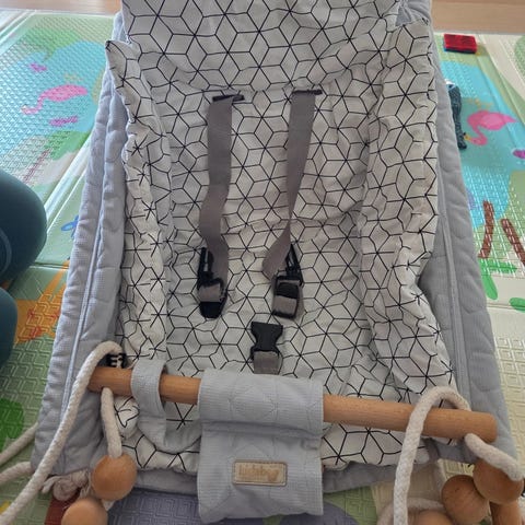 Høy barnestol i tre. Barnestolen har et rundt ryggstøtte og et brett foran som kan brukes som bord. Stolen er designet for barn og har hjul for enkel flytting. Passer til bruk i hjemmet for barn som trenger en høy stol til måltider eller aktiviteter.