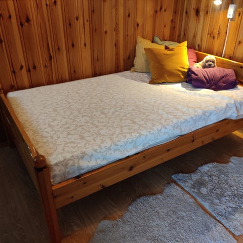 Seng m/madrass gis bort. Både ramme og madrass er av eldre type, men pent brukt på gjesterom.