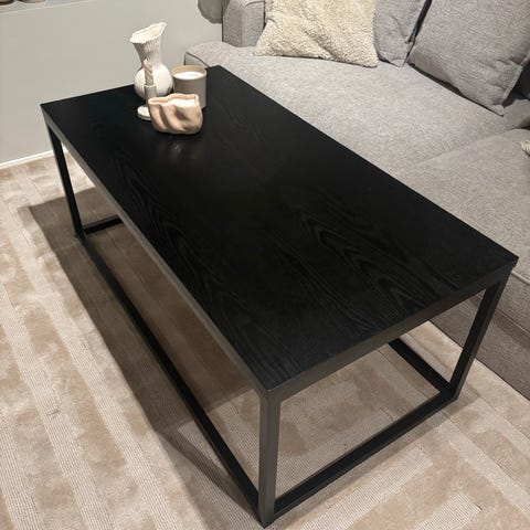 Pent brukt sofabord fra Skeidar selges. Bordet har et stilrent og moderne uttrykk med sortlakkert trefinnish og solide, sorte metallben i U-form. Passer godt inn i både moderne og klassiske stuer.