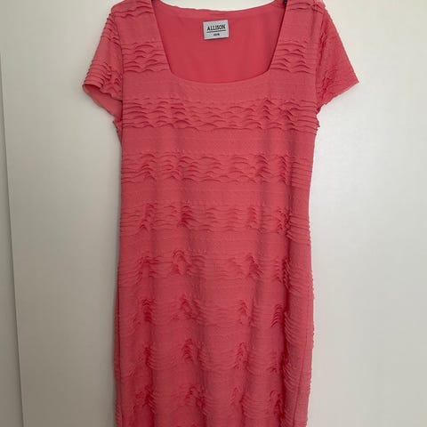 Nydelig rosa kjole i florlett stoff og utsvingt skjørt.