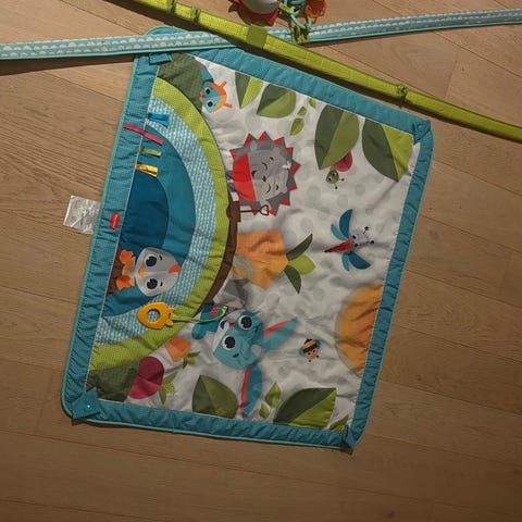 Babygym fra Tiny Love selges billig. Jeg kjøpte det ny i fjor for ca. 800 kr og det er pent brukt, bortsett fra de små bånd som ble ødelagt av seg selv kort tid etter kjøpet. Jeg klippet ut to av de (se bilde).