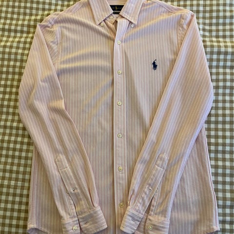 Ralph Lauren Knit Oxford skjorte i rosa farge, størrelse S for damer. Laget av bomullsmateriale. Skjorten har klassisk design med knappestolpe og krage. Lite brukt. Ny pris 2195kr.
