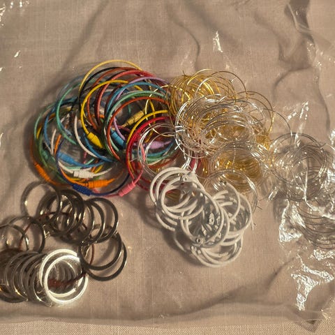 Glanspapir med ferdig utstansede maler til å lage 10 flettehjerter i tre ulike størrelser. Ser ut som om fargene er rød, blå, grønn og hvit.