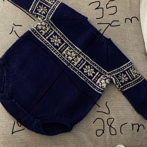 Hjemmestrikket ullbody til baby 3-6 måneder.