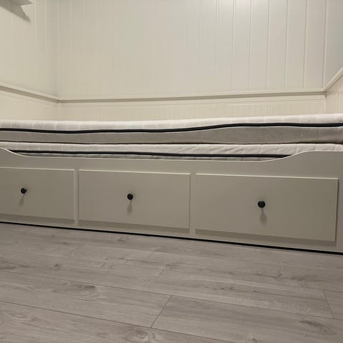 En sofa, en enkeltseng, en dobbeltseng og oppbevaring i ett enkelt møbel. Perfekt hvis du har lite plass. Hvis du liker stilen, kan du kombinere den med andre møbler i HEMNES-serien.