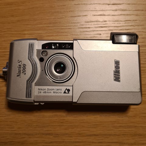 Nikon Nuvis 160 i kamera. Inkluderer etui i blått materiale. Egnet for analog fotografering med 35 mm film.