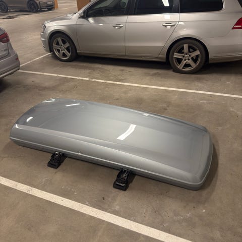 Skiguard 830 takboks i svart farge. Designet for montering på takstativ, egnet for transport av ski og annet utstyr. Har tidligere vært montert på en Tesla model Y. Takstativ følger ikke med. Boksen står lagret i garasje i Son. Boksen må hentes.