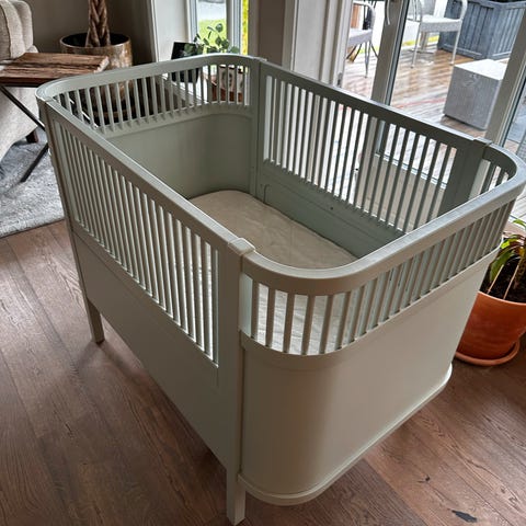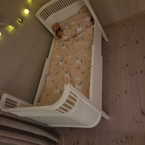 Sebra Sprinkelseng barneseng, eldre modell. Har ikke heve- senke funksjon. Har forlenger til junior del + madrasser. Bruks slitasjer- prises deretter