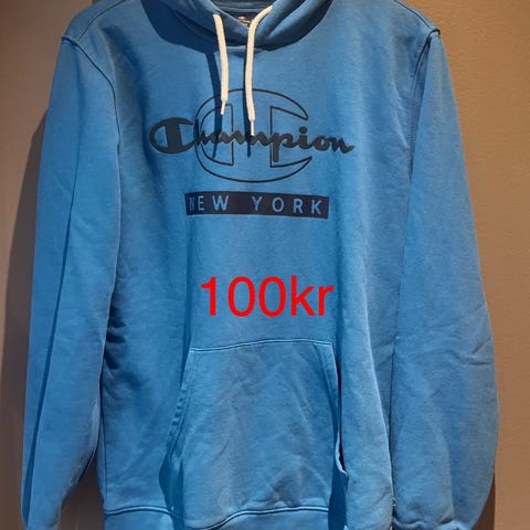Champion hettegenser i størrelse L, laget av bomull. Hvit farge med blått og gult Champion-logo på brystet. Genseren har hette med snøring og kengurulomme foran. Ribbestrikkede mansjetter og linning med stripemønster i blått og hvitt.