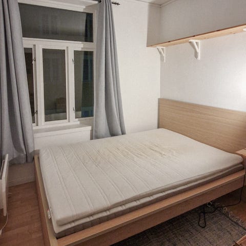 Seng 90*200 med treben og overmadrass selges. Har stått lagret inne. Må hentes.
