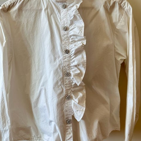 Nydelig lys blå bluse med prikker og volanger fra HM. Trenger en runde med steamer eller strykejern da den har blitt hengene en stund i skapet uten bruk. Str 34 men litt stor i str - vil si den også kan brukes av en 36. #bluse #volanger