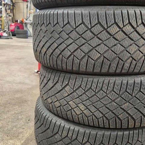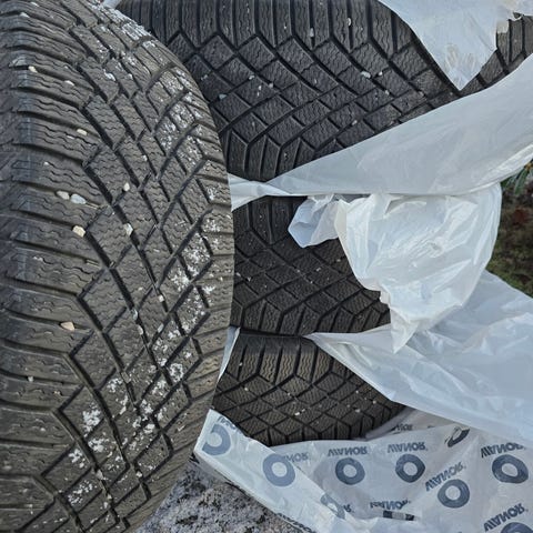 Nye Continental VikingContact 7 som ble levert på en 2025 modell VW ID Buzz. Ble brukt en måned før jeg fikk aluminiumsfelger med samme type dekk.