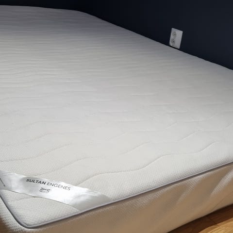 Enkeltseng med ben og overmadrass – gis bort