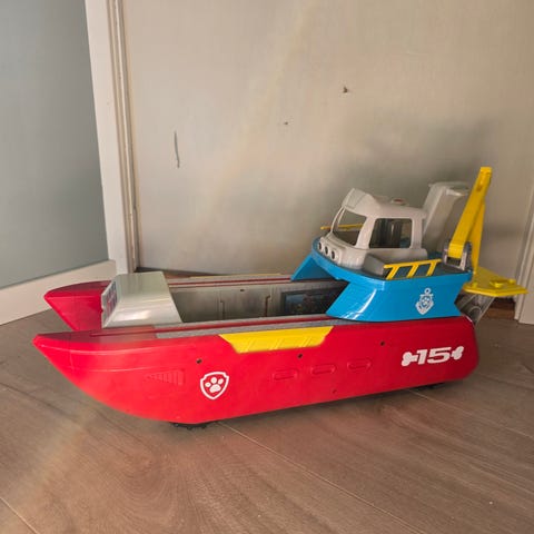 Paw Patrol barnleker som inkluderer ulike kjøretøy og figurer fra serien. Settet består av biler, båter, helikopter, motorsykkel og flere karakterer.