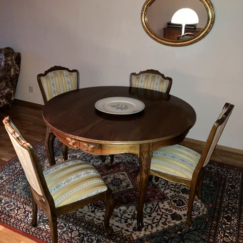 Bord 160*100 med 2 ileggsplater 2*45 Og 6 stk stoler. Litt merker på bordplaten..