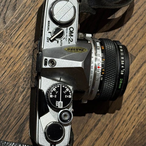 Konica kamera. Kameraet har innebygd blits og automatisk fokus, egnet for bruk med 35 mm film. Kommer med et beskyttende kamerafutteral.