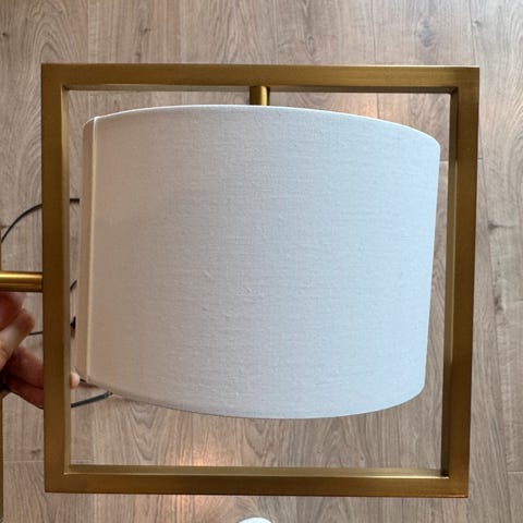 Retro vegglampe i messing med to armer og hvite stoffskjermer med dekorative kanter. Lampen har en klassisk design og passer til belysning i stue eller soverom.