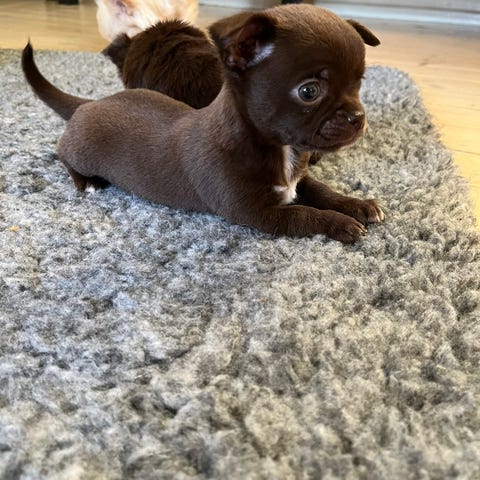 Dette kullet bestod av tre friske chihuahua gutter født 3 november. Den ene er allerede solgt, nå er det bare to korthåret gutter som søker etter sitt for evig hjem💗De er veldig snille, sosiale og lekne valper.. elsker å sove i armkroken eller oppå brystet, og gir masse kjærlighet💗Veldig spesielle personligheter og logrer med halen konstant. Black & white korthåret gutt selges for 13000 og chocolate & white korthåret gutt selges for 14500. og Både mor og far er friske. Far er renraset blue tricolor barbarcon chihuahua, og mor er kremfarget halv malteser, 25% pomeranian, 25% chihuahua. Av personlig erfaring vil jeg si at disse hundene er veldig allergy friendly, spesielt de som er korthåret. Og mest sannsynlig vil de få oppstående ører etter et par uker.