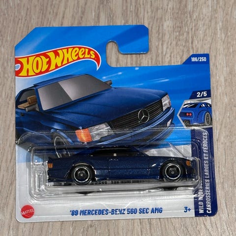 Hot Wheels '89 Mercedes-Benz 560 SEC AMG bilmodell i skala 1:64. Modellen har en grå metallic farge og detaljer som AMG-logo på bakenden. Samleobjekt eller leketøy for barn. En kul og detaljert modell!!