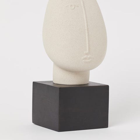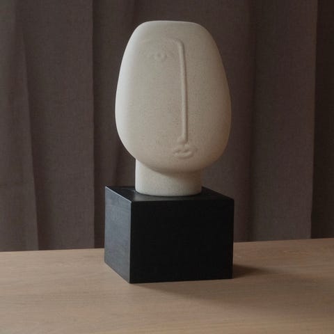 Abstrakt skulptur laget av beige keramikk, plassert på en svart/brun sokkel.