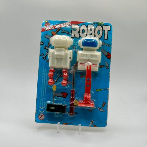 Blå robot leketøysfigur med detaljer i svart og rødt. Laget av plastmateriale. Passer som leketøy for barn. Lager lyd