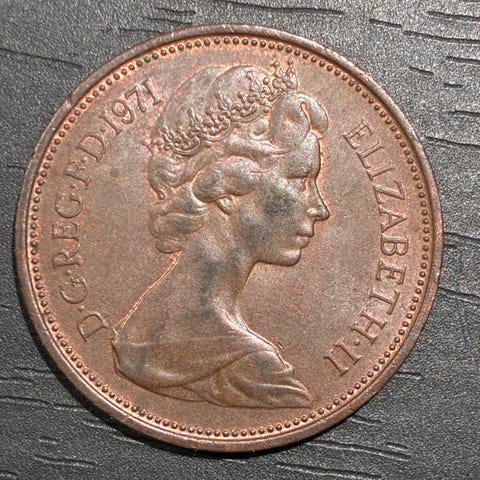 Storbritannia 10 Pence mynt fra 1969 med bilde av dronning Elizabeth II på den ene siden og en løve på den andre siden.